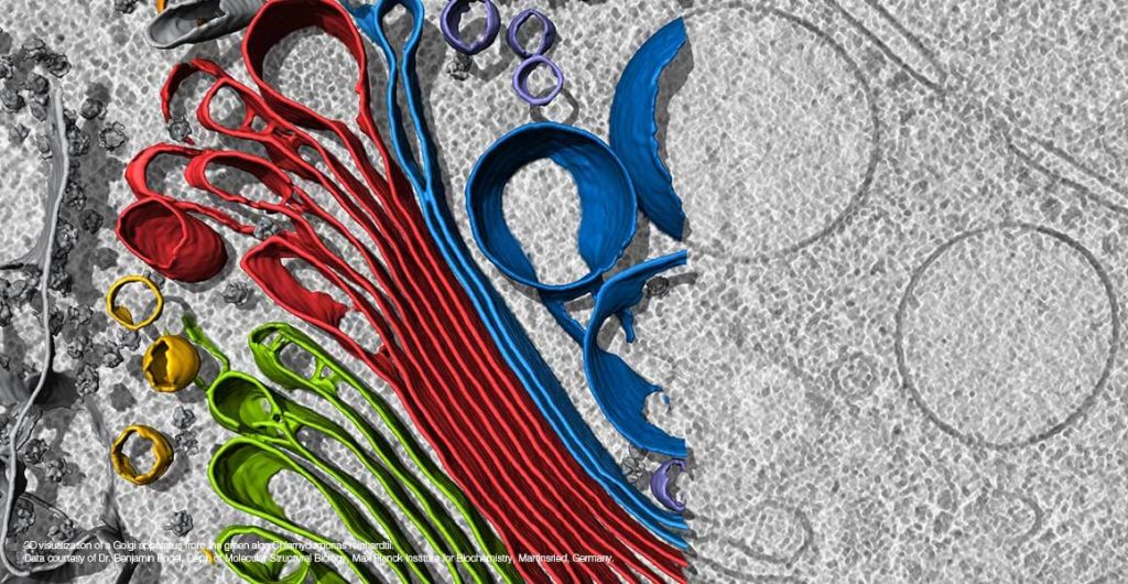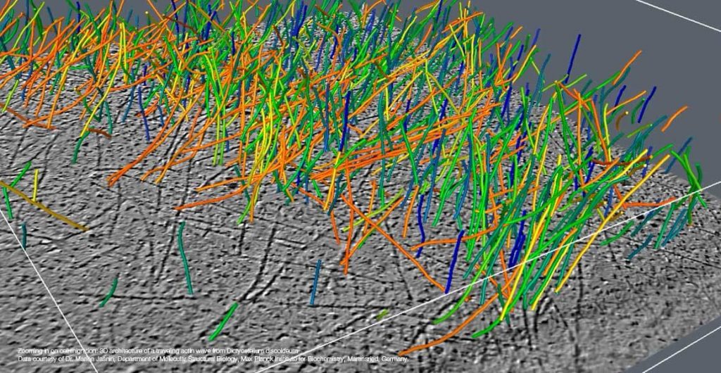 Amira Software accelerates segmentation by employing automated detection of cellular features, such as filaments and membranes. By performing advanced image analysis and statistics on the cryo-tomograms, Amira Software combines data from these individual structures, averaging out noise and increasing contrast to create a composite model with higher resolution.