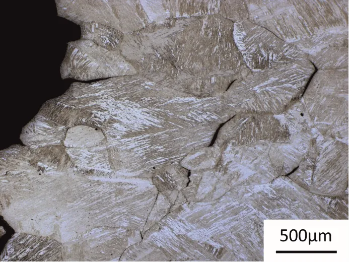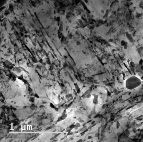 Figure 1 shows a Transmission Electron Microscopy (TEM) image of carbides (dark contrast) in quenched and tempered steel. The elongated carbides occur on lath-boundaries and are identified as cementite by the use of electron diffraction. The estimated size of martensite laths is related to the quenching process.