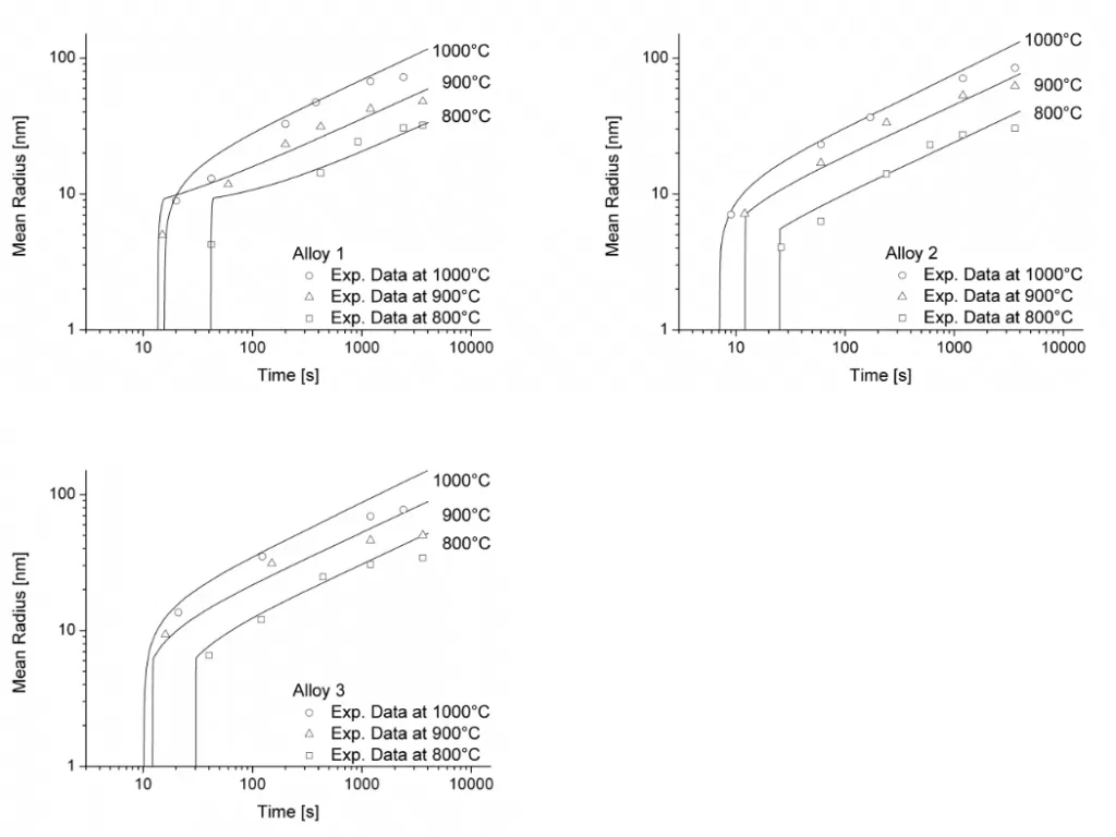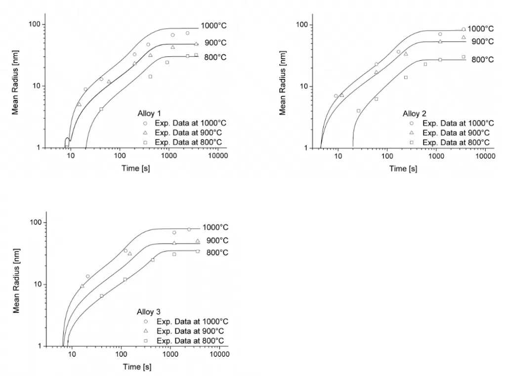 Figure 1 and 2 show the calculated radius versus time curves of MnS precipitation in three different alloys at temperatures of 800, 900 and 1000°C. Figure 1 summarizes simulation results for MnS precipitates located at grain boundaries, whereas precipitates at dislocations are shown in Figure 2.