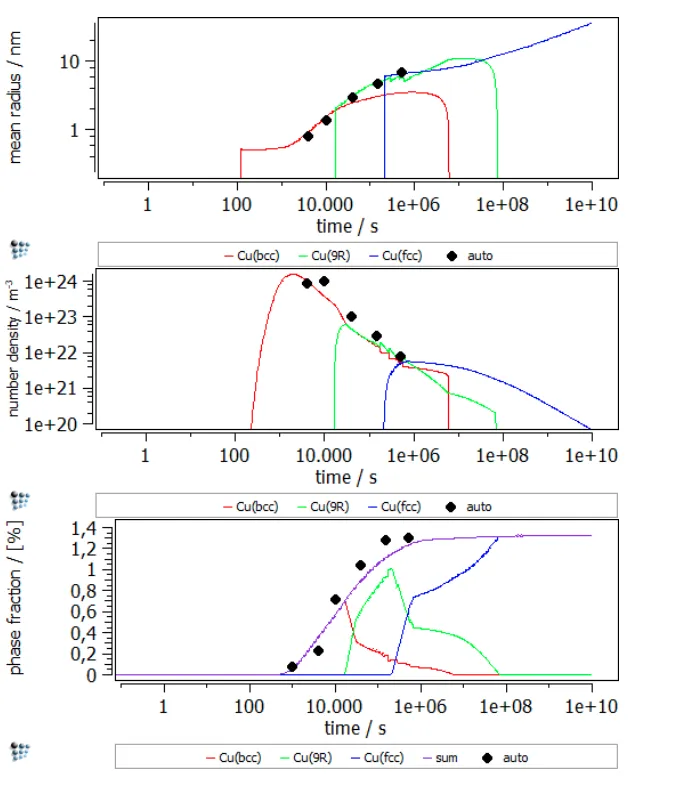 In this example, the yield strength simulation in binary Fe-Cu is shown. The strength of a material should be calibrated in a “simple” system and, then, the parameters can be transferred to complex alloys. The precipitation of Cu in Fe-Cu is based on the data of Goodman et al. (1973). It starts off with the nucleation of coherent bcc-Cu and evolves with the transformation to the semi-coherent 9R structure and the incoherent fcc-Cu. A direct-particle transformation is used for the evolution of Cu-precipitates. Figure 1 displays the calculated evolution of the mean particle radii, the number densities and the phase fractions of the different stages of Cu precipitates.