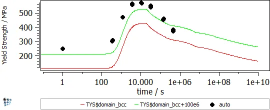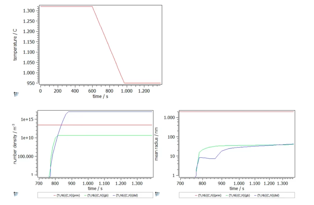 In the calculation, back diffusion of carbon and nitrogen as well as the peritectic reaction is considered. In Figure 2 the particle strengthening contribution to the yield strength is visible (red line). The other contributions, like work hardening, intrinsic lattice strength, solid solution strengthening, grain size strengthening and subgrain size strengthening, are considered for the green line.