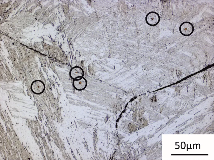 Microsegregation in microalloyed steel is studied in the Scheil-Gulliver module of MatCalc. It is used to predict primary precipitates during the continuous casting process. Primary precipitates in microalloyed steel, which are marked by circles, are visible in Figure 1.