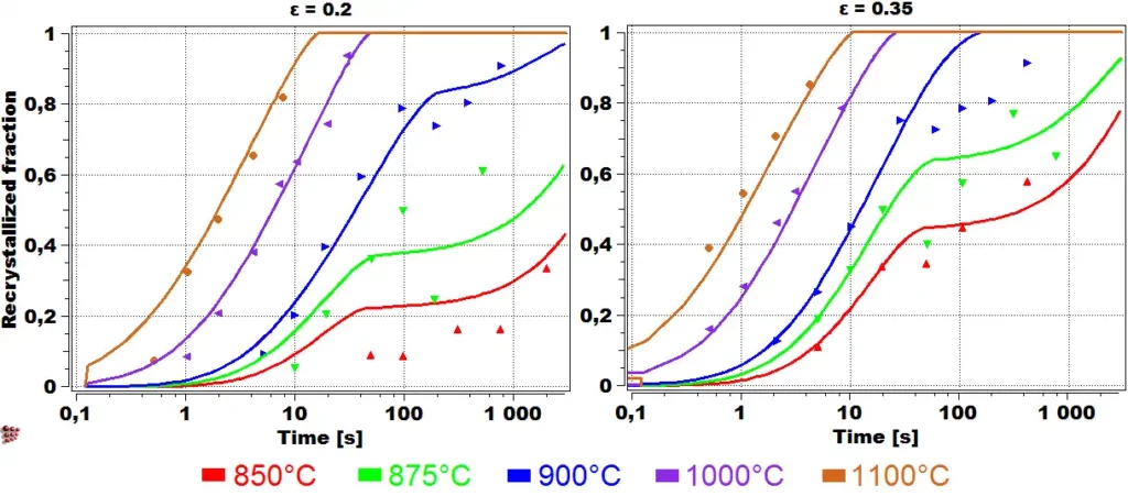 A simulation of the recrystallization progress in V-microalloyed steel for two strain values of 0.2 (left) and 0.35 (right) in compare with experimental findings (points). Recrystallization retardation by small precipitates of vanadium nitride is predicted for lower temperatures.