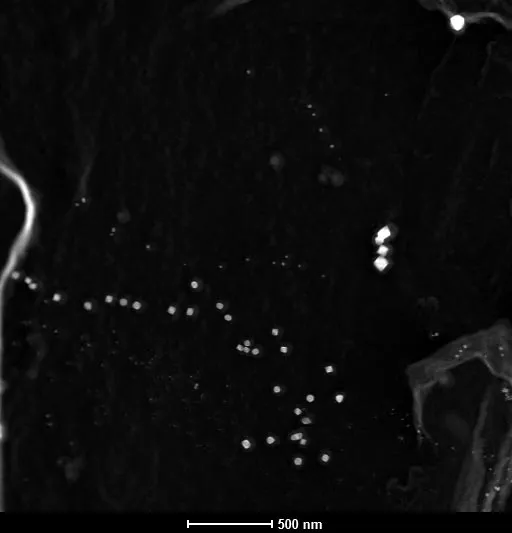 A complex heat treatment leads to a multimodal distribution of TiN precipitates in microalloyed steel. The figure below shows a Scanning Transmission Electron Microscopy (STEM) image with mass contrast (HAADF; the heavier, the brighter) of these particles. In this particular case the precipitates are extracted from the Fe matrix onto a thin carbon film (replica). Using this technique we are able to analyze particles down to several nanometers in size without disturbing contribution of the Fe matrix. Fig. shows three size populations of TiN precipitates. The chemical compositions of the nanoparticles were estimated using Energy Dispersive X-Ray Spectroscopy (EDX) and Electron Energy Loss Spectroscopy (EELS). The measurement of the sizes, chemical compositions and frequency of each population allows a better understanding of nitride precipitation and optimizing of the heat treatment.